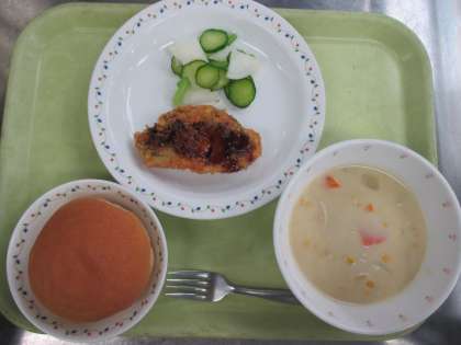 丸パン 牛乳 魚のフライ 野菜のレモンソースかけ クリームスープ