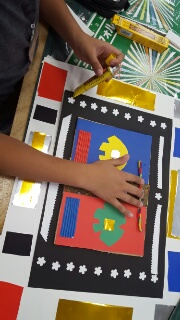 5年生は図工で、「色と形のハッピーセット」に取り組んでいます。色画用紙やカラーシールを使って、色と形を工夫して平面作品を製作しています。