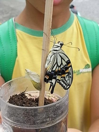 西門で「おはようございます!」と子どもたちと朝のあいさつをしていると、「校長先生、今ここでアゲハになったよ!」と写真のように羽化したばかりのアゲハを見せられました。しばらくすると、「校長先生、カマキリの子につけた!」と。またしばらくすると、片手の手のひらを開いて20匹ほどのダンゴ虫をみせたり、・・・・。子どもたちは本当に昆虫が好きですね。と思っていると、指にオレンジと黒のとげとげの毛虫をはわせて登校してきたり、未来のファーブル博士がうようよいるようで、楽しみです。