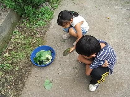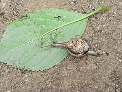 中休み、中庭を歩いていると2年生の子どもたちがいたので、のぞいてみると、ご覧のように、カタツムリを相手に2人で遊んでいました。大きなカタツムリの背中(?)の上に生まれたばかりのカタツムリを4匹のせて、遊んでいました。本当に玉小の子は虫が好きな子が多いです。