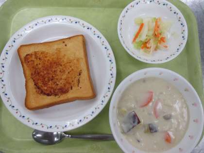 ガーリックトースト 牛乳 さつまいもシチュー きゃべつサラダ