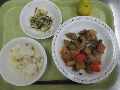 さつまいもごはん 牛乳 がめ煮 もやしのごま風味 みかん