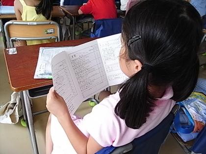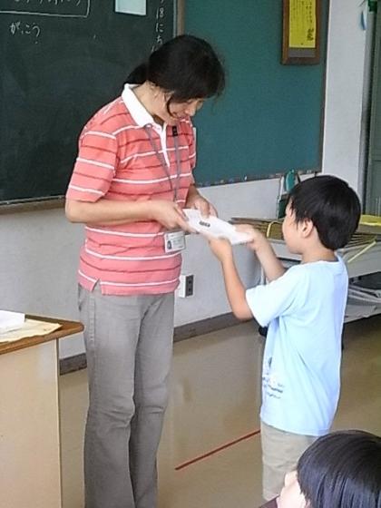1年1組で、通知表を松原先生から子どもたちが一人一人受け取っているところです。初めての通知表を受け取りながら、「1学期、どうもありがとうございました。」と上手に先生にお礼のあいさつをしていました。とっても大切そうに受け取る子、何かわからないけど、もらっている子。それぞれでした。でも,はじめての通知表、子どもたちの表情が神妙でした。2学期もがんばろうね。