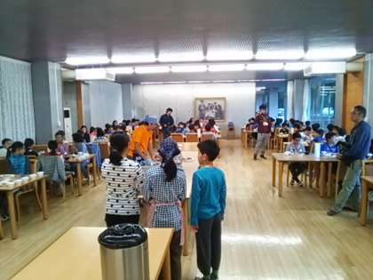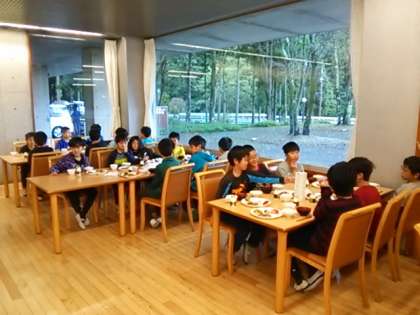 ふじやまビレジで初めて使う食堂での朝食になります。生活班ごとに座席があります。