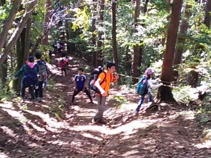 「21世紀の森」コースの下山です。下りの難所にはロープがあります。自身のある子は左、ロープを使う子は右を進みます。