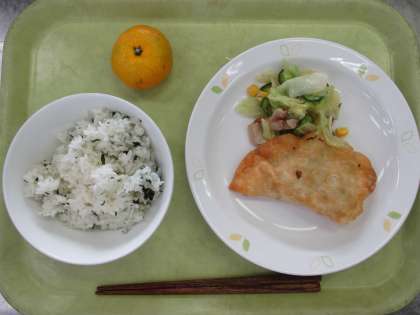 わかめとじゃこのご飯 牛乳 ジャンボ餃子 中華サラダ みかん
