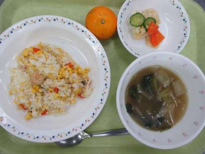エビチャーハン 牛乳 カリフラワーの中華和え 白菜と春雨のスープ みかん