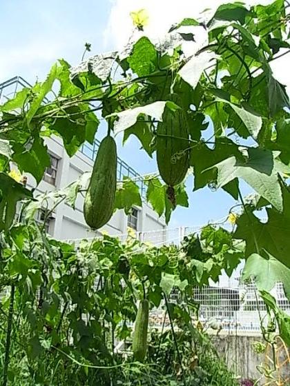 中庭で4年生が育てているヘチマが、見事な実をつけました。そろそろ収穫ですよ。