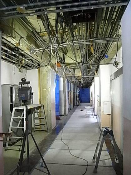 廊下の耐震補強が今回の工事のメインです。廊下と教室の仕切りを取り払いより強度のあるものに代える工事になります。さて、写真の場所は、放送室、職員室前の廊下です。こんな工事をしているんです。
