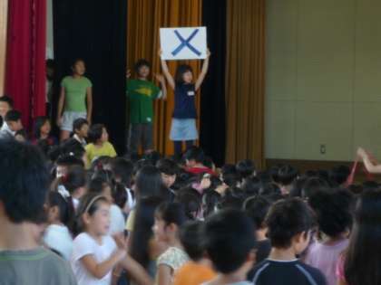朝、体育館で集会委員会による児童集会○×クイズが行われました。「玉川小の学級数は21学級である。○か×か」たくさんの子供たちが×のほうに移動。「正解は、○です。」というと、「え〜?!」という反応。子どもたちは分かっているようで、わかっていない様子も見られて、おもしろかったです。
