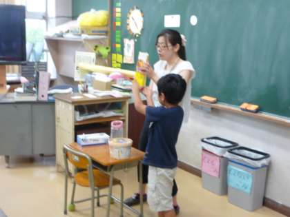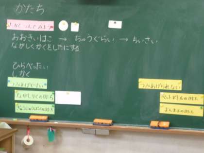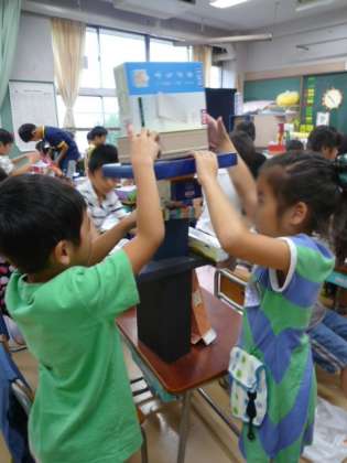 1年2組の算数の授業を見ました。「かたち」の勉強で、集めた空き箱を積み上げて、高く積み上げやすい形とそうでない形の違いについて考えました。子どもたちは、家から持ってきた空き箱やペットボトルを使って、どれを土台にしてどう積み上げたら高くなるか真剣に考えていました。友だち同士で協力して考えている人もいました。とても楽しそうでした。