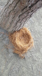 松の木の下に、こんなものがありました。鳥の巣? こんなところに鳥は巣をつくりませんね。だれかが松の葉でつくったのでしょう、ユーモアいっぱいの朝の光景でした。
