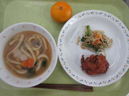 煮込みうどん 牛乳 手作りさつま揚げ 野菜の胡麻和え みかん