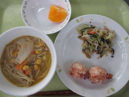 札幌ラーメン 牛乳 じゃがまるくん のり酢あえ 果物(夢オレンジ)