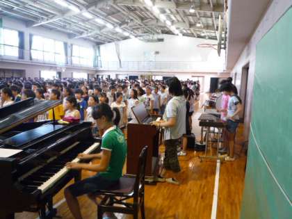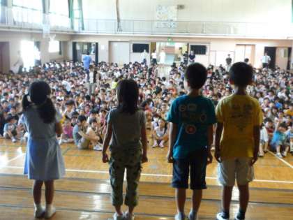 朝、体育館で1学期の終業式を行いました。2年生の4人が児童代表の言葉をしっかりと発表してくれました。1学期がんばったことと2学期に向けてのことを一人一人が話している間、全校のみんなが静かに聞いてくれていました。そのあと、音楽クラブの人たちが校歌の演奏をしてくれました。1学期子どもたちが元気に過ごせたことを感謝するとともに、この42日間の夏休みの間、一人一人の子どもたちがたくさんの貴重な体験をし生長してくれることを祈念しています。また、9月1日には、全員が元気に体育館に一堂に集まってくれることを心から願っています。