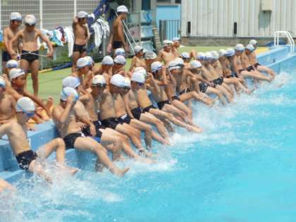 いよいよ今日から、夏休み恒例のプールが始まりました。高学年、中学年、低学年の順に行われます。中学年・低学年では100人を超す人が参加して、にぎやかに行われていました。今日から20日間のに予定で行われます。たくさんの人が参加し、体力や泳力をつけてほしいです。忘れ物をすると、水泳に参加できません。よく自分でチェックしてから、学校に出かけましょう。