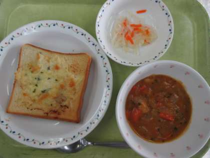 ツナポテトトースト 牛乳 ビーンズシチュー 大根の甘辛漬
