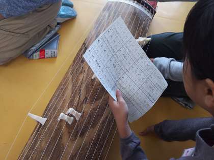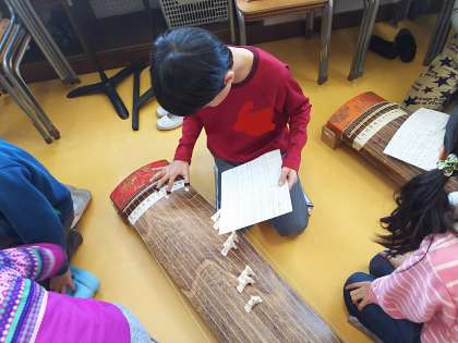 爪をつけて弦を弾き、琴の音色を楽しむと共に『さくらさくら』をペアで協力しながら演奏することが出来ました。