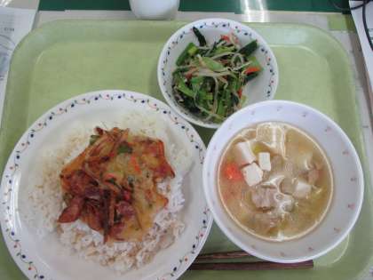 かき揚げ丼 牛乳 野菜のごまだれかけ 豆腐汁