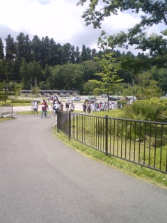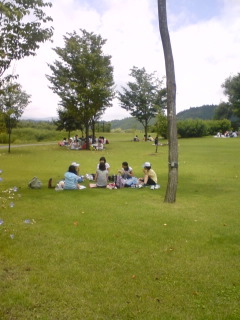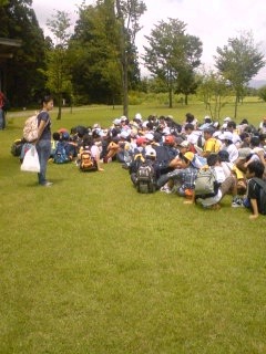 日光林間学園(1日目)日光大谷川公園にて。お家の弁当をあっという間に食べて、芝生の中を思い切り遊んでいます。