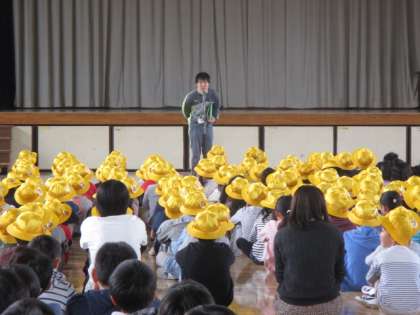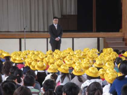 今朝は、一年生も入った初めての朝会です。一年生も上手に並んでいます。みんな話の聞き方が、とても上手です。
