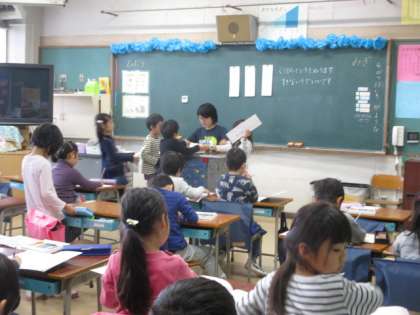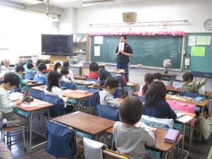 朝から雨の中、一年生は元気に登校してきました。傘を丸めて、上履きをはいて静かに教室に入ります。