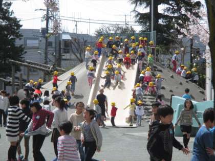 休み時間に校庭遊びです。校庭デビューです。力山に1年生がいっぱいです。