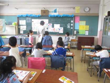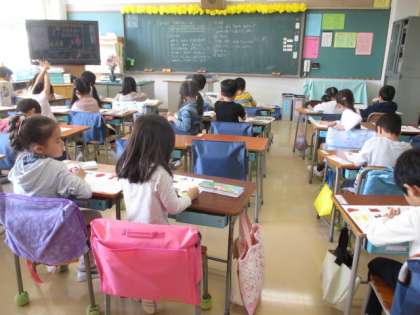 今日の一年生。好きな絵をたくさん描いています。果物、昆虫、電車、キャラクターなどなど好きな絵をいろいろと描いています。