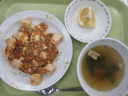 麻婆豆腐丼 牛乳 わかめスープ 果物(はるか)