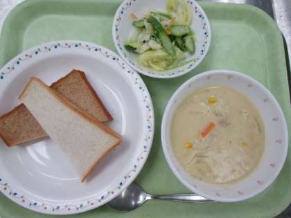 二色サンド 牛乳 コーンシチュー アスパラガスのサラダ