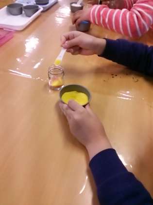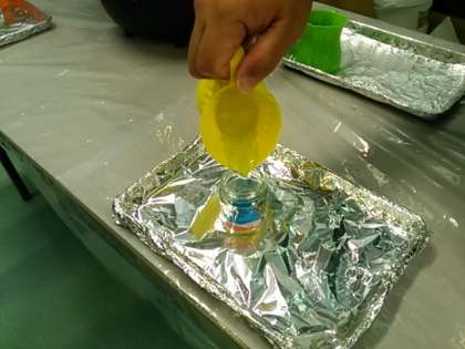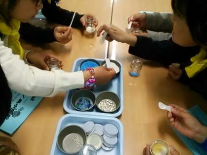 色砂、貝殻、ビーチグラスを瓶に入れてから、溶けた蝋を入れてもらいます。あとはキャンドルの芯を入れて完成です。