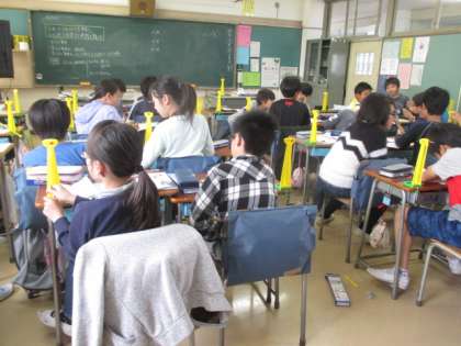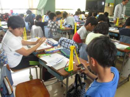 5年生が理科の学習をしています。「ふりこ」の学習です。それぞれで、振り子が往復する時間を計っています。この実験から課題を見つけて学習を進めます。みんな、真剣です。