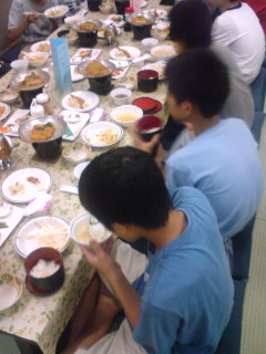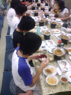 日光林間学園(2日目)夕食風景。今日は随分歩いたので、食欲旺盛な子が多そうでした。