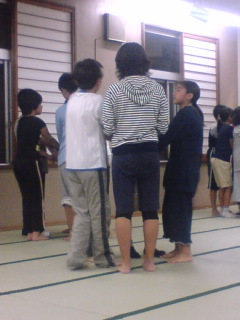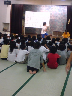 日光林間学園(2日目)室内レクレーションにて。日光での最後の夜のお楽しみ会です。班ごとで、人間知恵の輪、連想ゲーム、先生によるジェスチャークイズなどで得点を競いあって楽しんでいます。