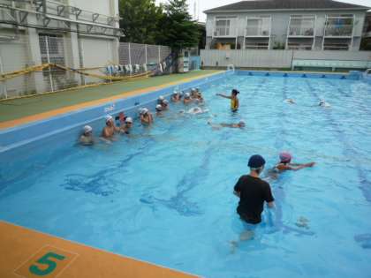 昨日までの猛暑と打って変わって、曇りがちの天気の中でのプールです。昨日は、猛暑もあり、また、お盆休みでの帰省もありで、参加者が幾分少なかったのですが、・・・・。ふたを開けてみると、やはり日差しが少ない分、前半の組は子どもたちの人数も少ないようでした。でも、出席している子どもたちはとても元気に泳いでいました。「明日の検定受ける?」「うん、受けるよ。」という会話も聞けました。