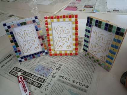 全部で20種類くらいの色の違うカラフルなタイルを使って、すてきな写真立てを作りました。一人一人選ぶタイルの色や色合わせが違い、すてきなタイルに仕上げていきました。作業中は、みんな真剣に集中して手に接着剤がついていても気にせず、やり遂げていました。集合写真の笑顔がすてきでした。