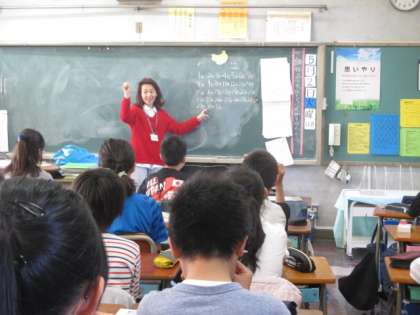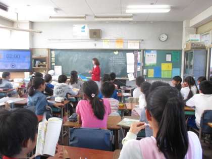 6年生が、英語の学習をしています。今日は日にちや月の言い方です。みんな大きな声で言うことができています。英語支援員の若松先生が楽しく教えてくださっています。