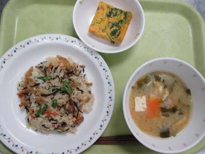 ひじきごはん 牛乳 卵焼き じゃがいもの味噌汁
