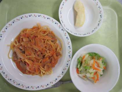 スパゲティトマトクリームソース 牛乳 春キャベツのサラダ りんご