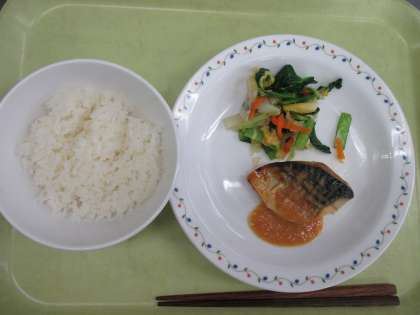 ごはん 牛乳 さばのピリ辛ソースかけ 野菜のおかかかけ
