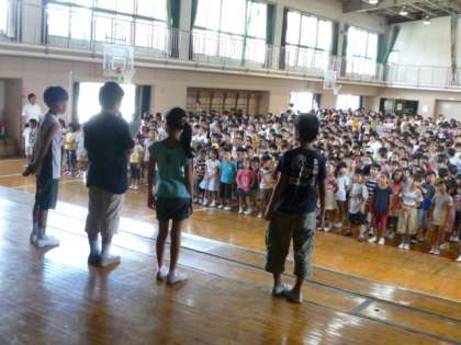 そのあと、体育館で始業式を行いました。4年生の学級の代表の人が、夏休みの思い出の話や2学期がんばることについて話してくれました。
