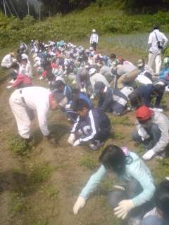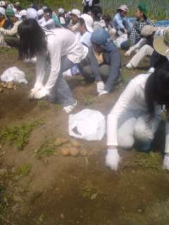 勤労体験学習でじゃがいも掘り。はじめは表面を掘っていましたが、慣れるにしたがって深いところの大きな芋を見つけていました。いい体験ができました。