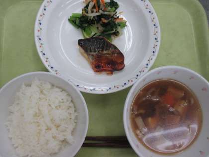 ごはん 牛乳 さばの塩麹焼き 野菜の海苔和え 鶏ごぼう汁