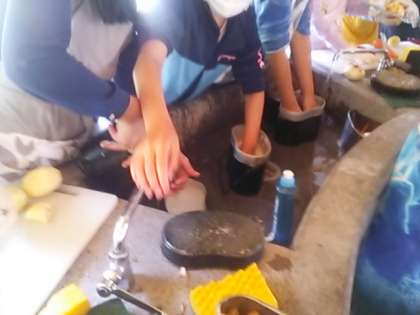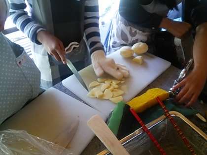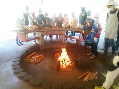 カレー作りを始めました。火をおこして、飯盒で米を炊きます。カレーは野菜を切って・・・。