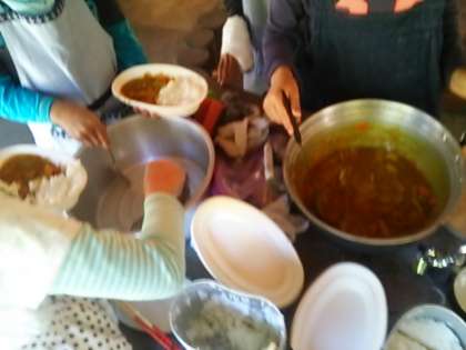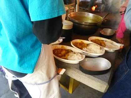 カレーライスが出来上がりました。8等分にして、漬け物をのせて完成です。