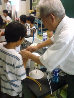 今日は、理科室でカルチャースクールの理科実験教室の第一回目が行われています。東京工業大のOBの方々が講師で指導してくださいます。はじめに、なぜ科学が進歩したか。それは理科の授業のおかげです。と言うお話がありました。今日は、ヘロンの噴水実験です。噴水がどこまで高く上がるか楽しみです。