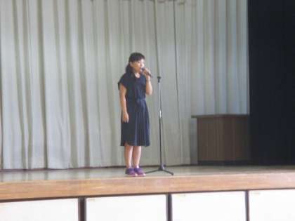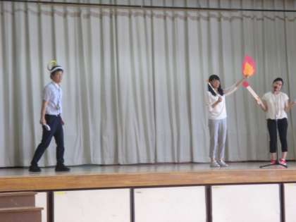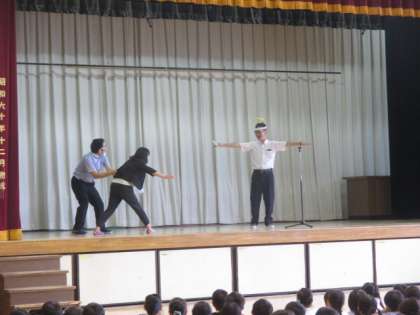 終業式の後、夏休みの生活について生活指導の先生方が劇で指導しました。