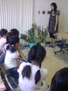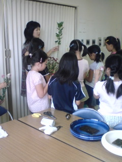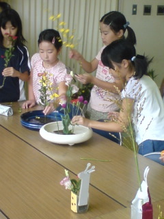 今日は華道教室が開催されました。講師は、保護者の角さん、地域の田中さんと遠崎さんでした。華道の歴史や生け方、花の見方などを学んだあと、一人でお花と向かい合いました。一生懸命頑張ってやっています。