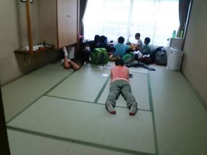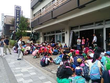 宿泊する「ホテル春茂登(はるもと)」に到着しました。開園式のあとは避難訓練、そして荷物整理を終えたらハガキを書きました。その後入浴です。