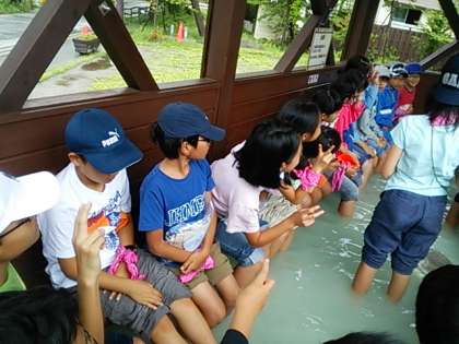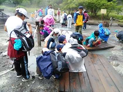 雨ですが、玉川小学校が行くところは不思議と小雨になります。源泉では10円玉の化学反応と足湯を楽しみました。